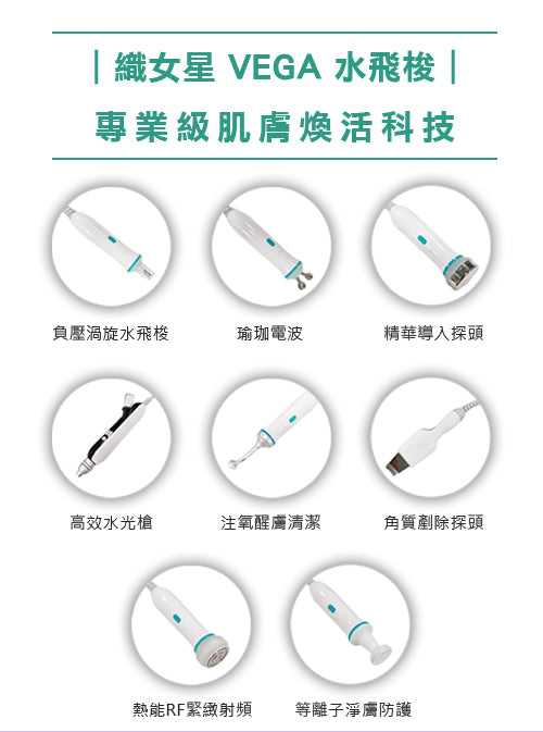 VEGA水飛梭儀是新世代多功能肌膚管理平台,結合醫美等級的水飛梭科技與智慧導入系統,專為各類膚況設計,提供深層清潔、精準導入與彈潤緊緻等全方位護理,打造高效、安全、無創的煥膚體驗。