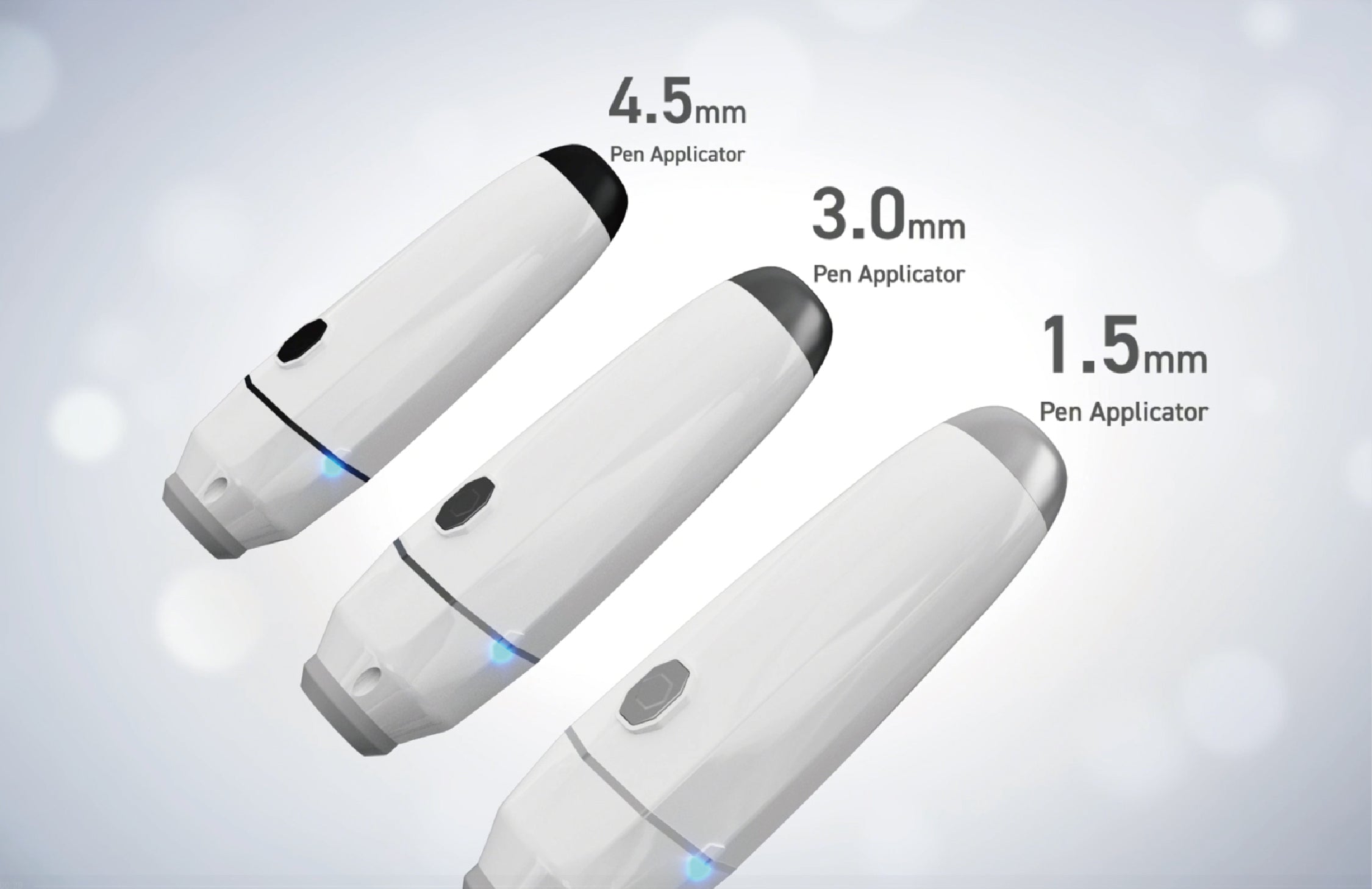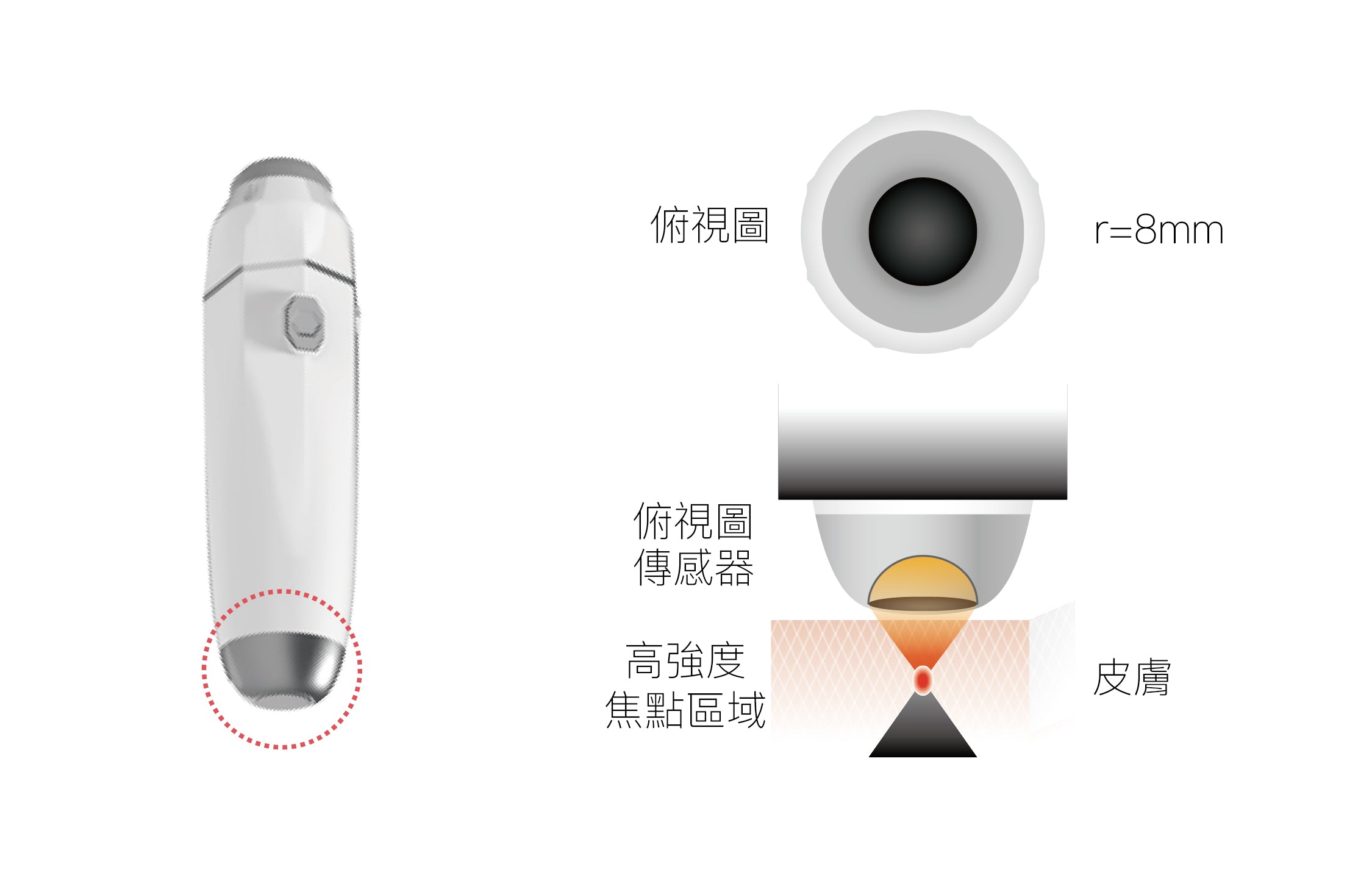 Liftera2筆型提供最小面積接觸皮膚,更 容易針對小部位進行操作治療。探頭半 徑僅8mm,適用貼合臉部各角度。