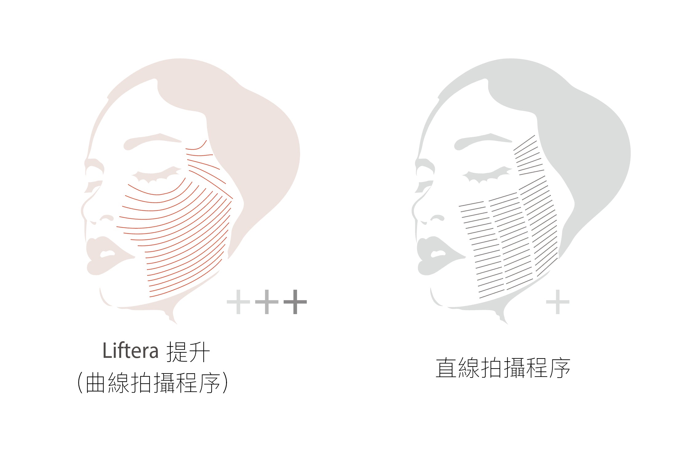 與線性音波不同,Liftera2可自由貼合臉 部曲面滑行操作,不侷限線性治療,更 易控制能量並加強治療區。