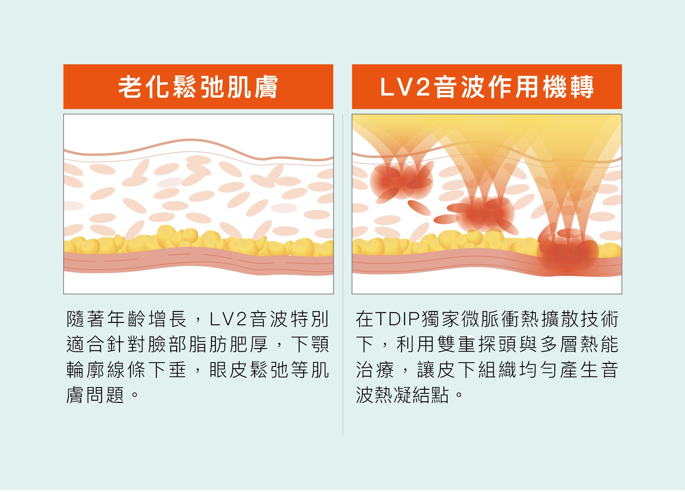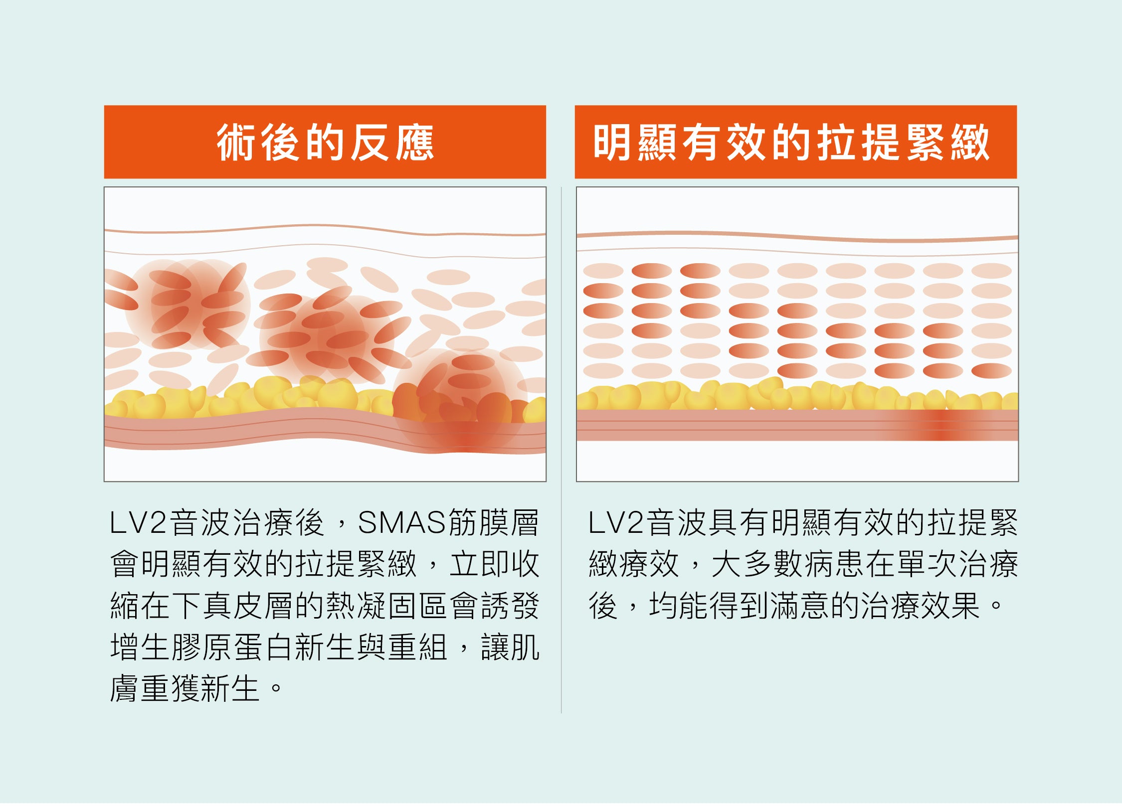 高強度聚焦超音波(HIFU)能穿透組織直達目標區域膚層,在該區產生熱凝結點與熱擴散效應,促使周圍組織緊縮、膠原蛋白的再生重組,進而改善皮膚細紋、拉提緊緻並提亮肌膚。