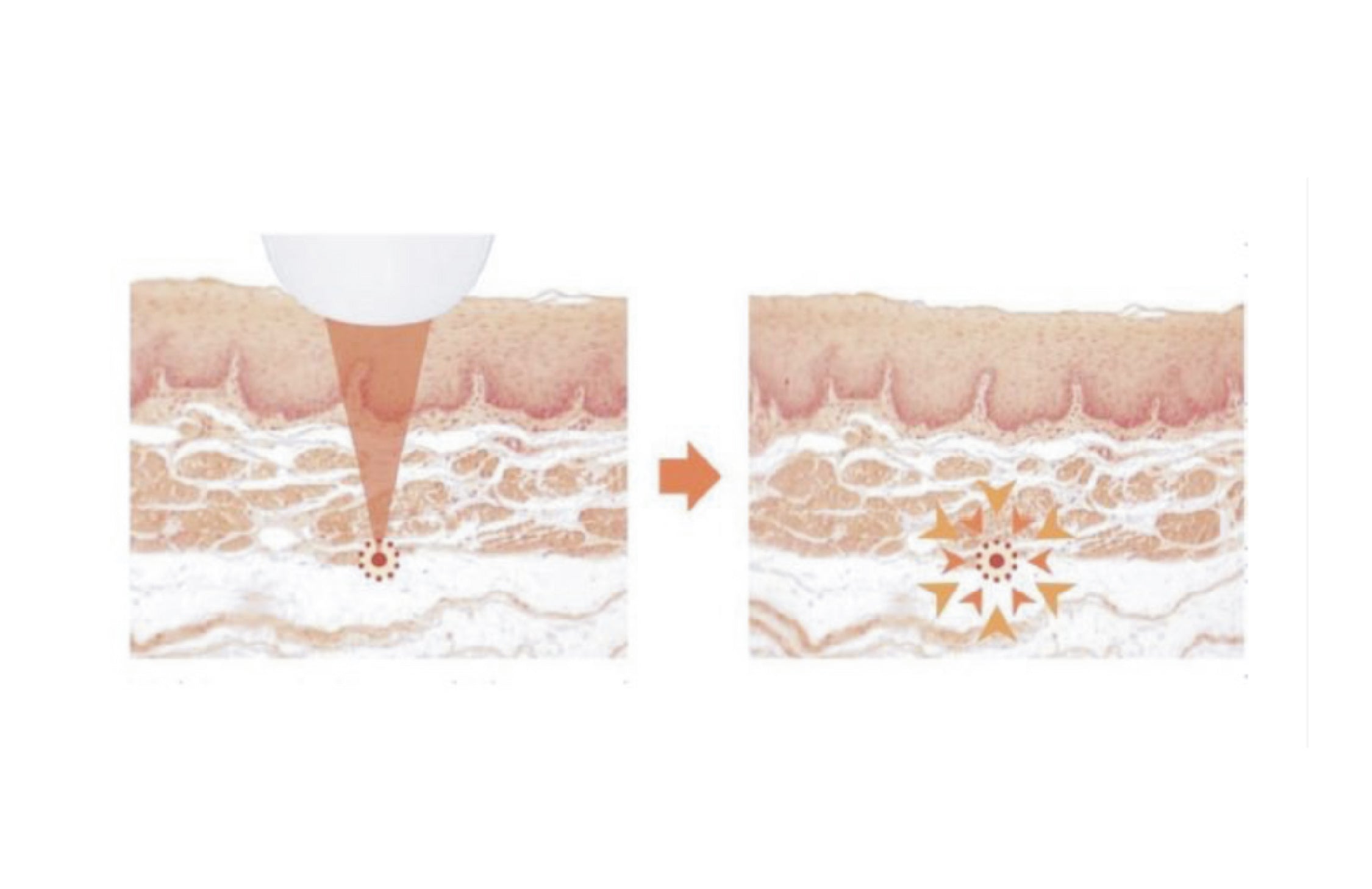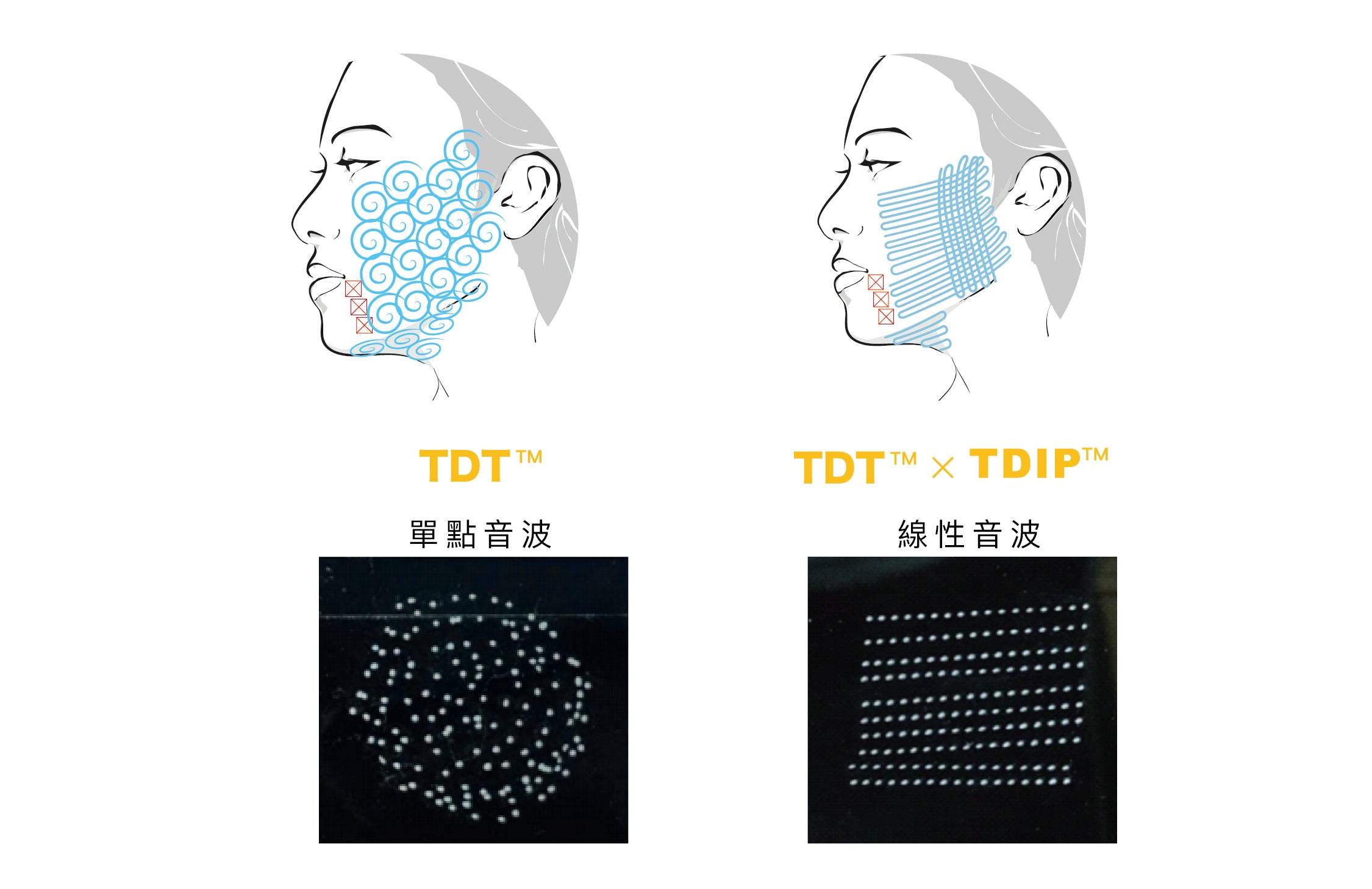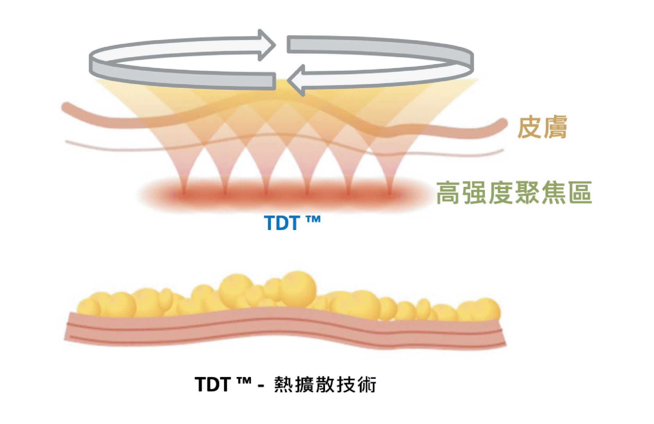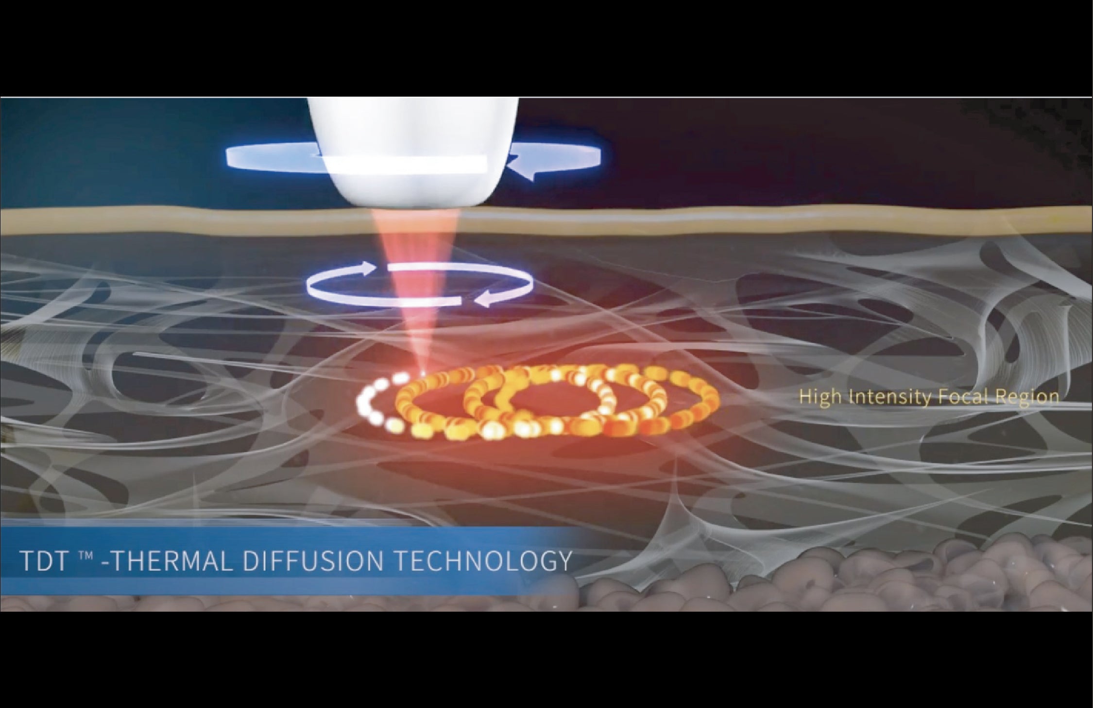 在高達每秒10發的高頻發射,醫師控制滑動速度和方向,逐漸在目標拉提位置形成 聚焦熱區 (Thermal Zone),利用高強度聚焦熱擴散技術TDT (Thermal Diffusion Treatment),藉此提高刺激膠原蛋白新生重組,達到低痛卻高效收縮拉提效果。