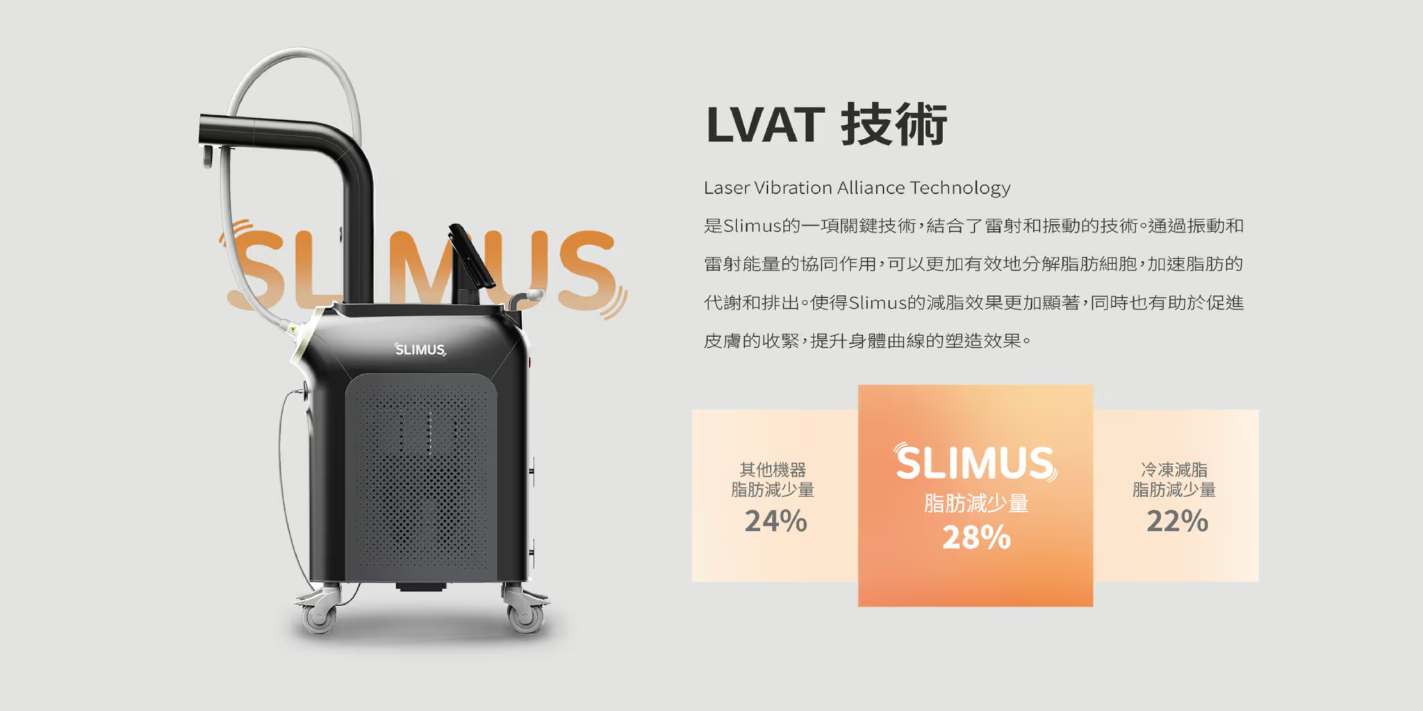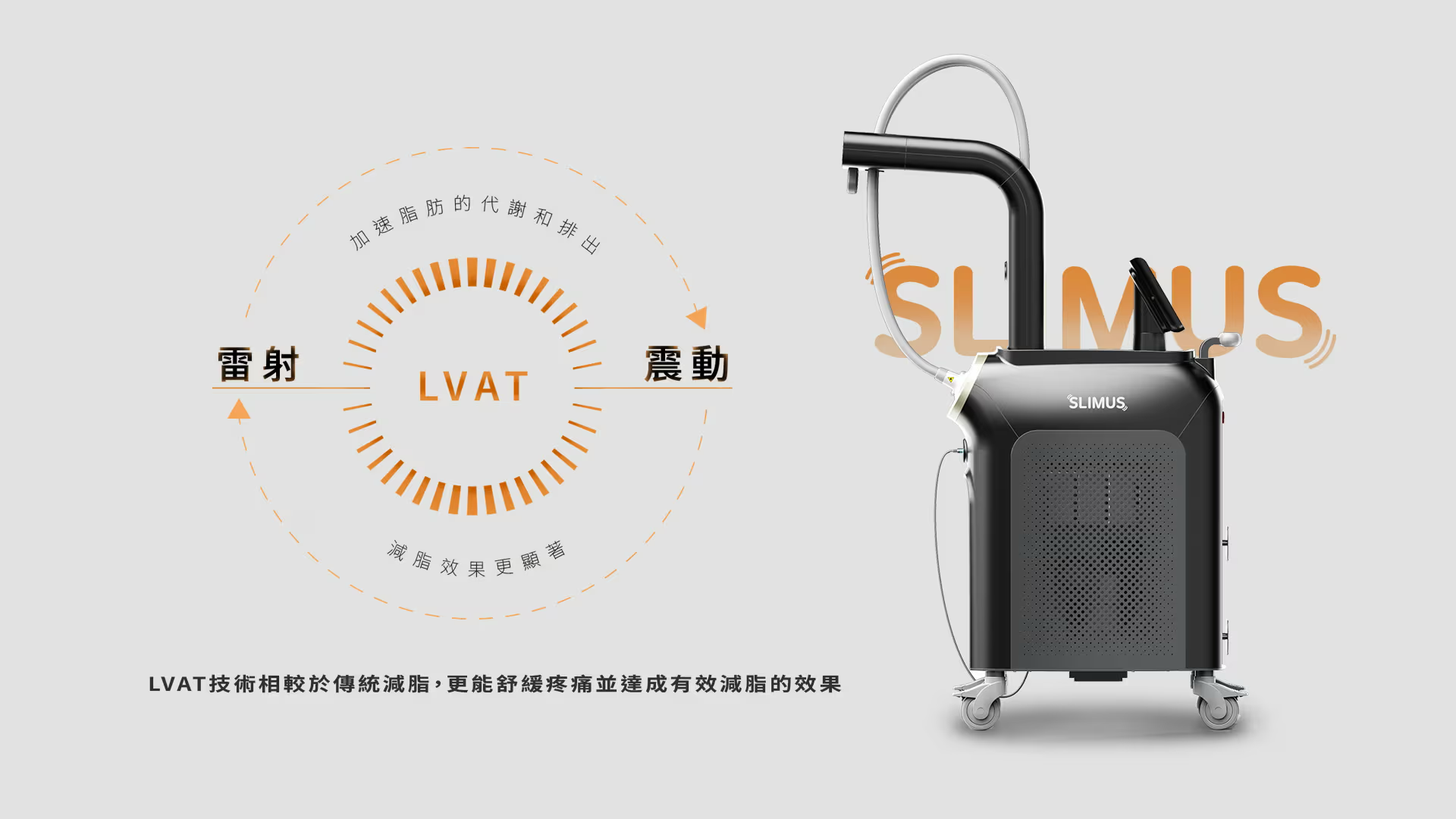 SLIMUS希立纖專利的LVAT科技擁有雷射與高速震盪循環輸出,透過循環輸出,能加快脂肪被破壞的效率,並加速消除脂肪細胞,活化身體代謝能力,並且讓被破壞的脂肪細胞快入排出體外,有效達到減脂的目的。